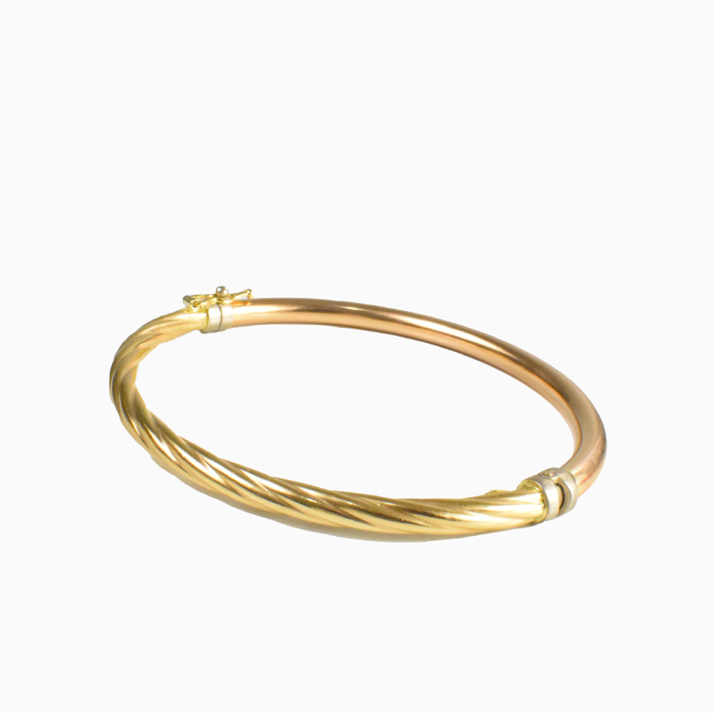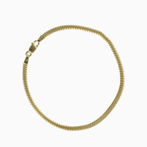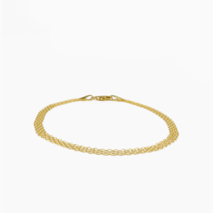 Esta pulsera de oro con tejido tipo melcocha destaca por su diseño dinámico y sofisticado. Sus eslabones entrelazados crean una textura única, reflejando luz con un brillo cautivador. Perfecta para quienes buscan un accesorio exclusivo que combine estilo y elegancia, ideal para complementar cualquier atuendo con un toque de lujo.